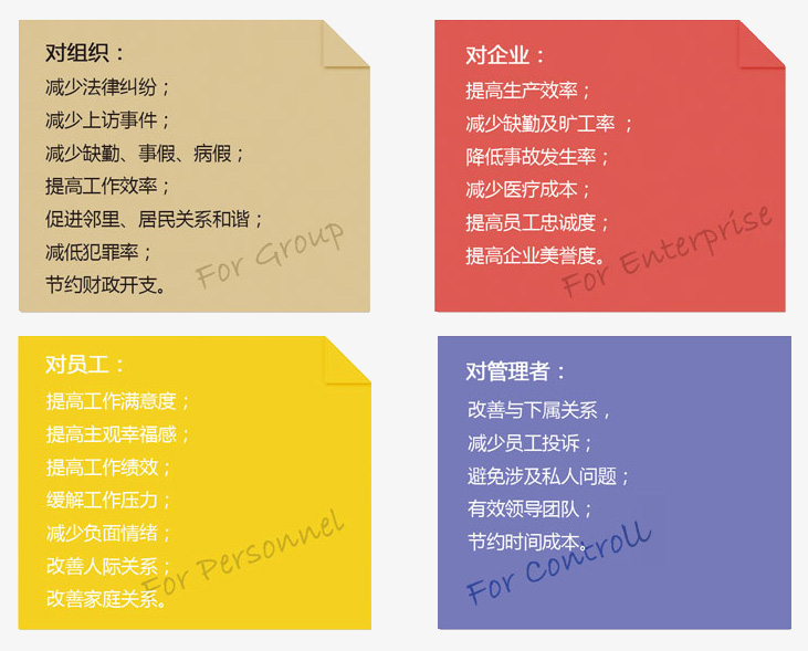 EAP(Employee Assistance Program)是通过专业人员对组织的诊断、建议和对员工及其家庭成员提供的专业指导、培训、咨询,帮助解决员工及其家庭成员的各种心理和行为问题,提高员工个人绩效和组织整体效能。